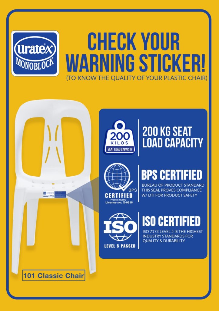 Now, as regular consumers, how are you going to know the durability, capacity, and certification of a monobloc chair? All you have to do is check the warning sticker of a monobloc chair!
